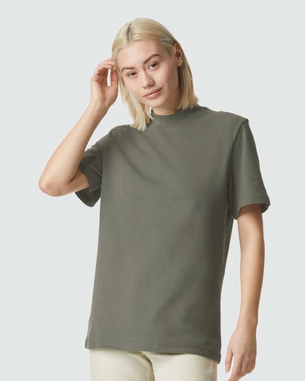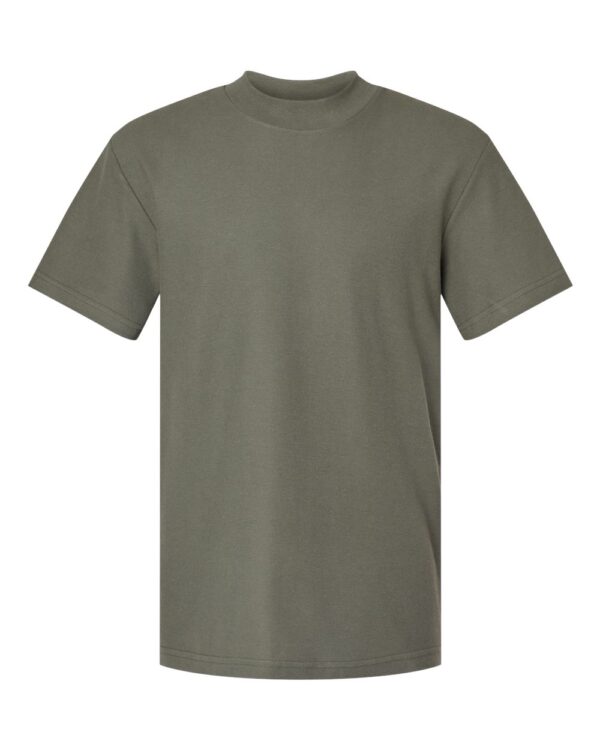6.5 oz./sq², 100% ring-spun cotton, 24 singlesHeather Grey is 90/10 cotton/polyesterTextured, heavy weight ring-spun cotton piqueRelaxed fitRib mock neck collarTaped neck for comfort and durabilitySide seamsRecycled tear away labelAmerican Apparel…