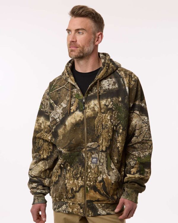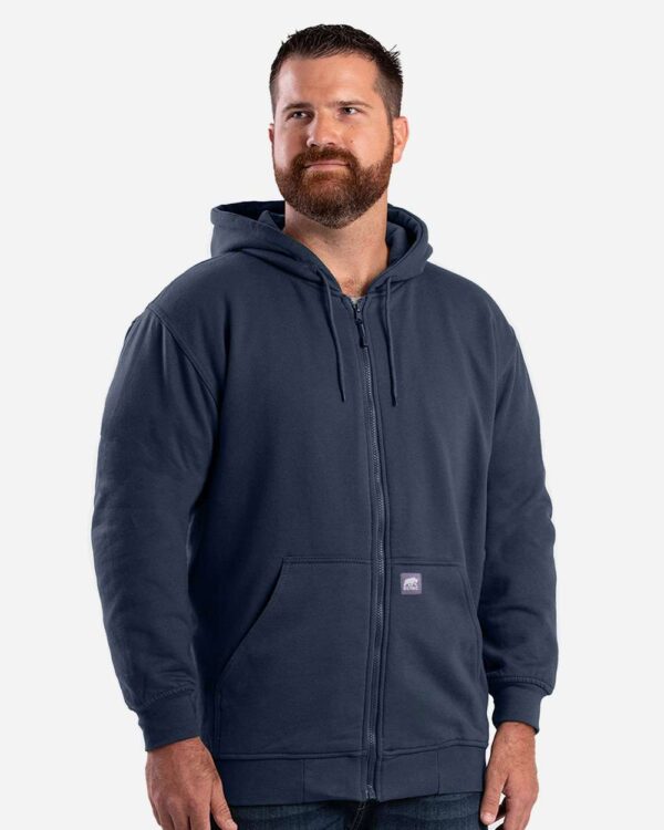 9 oz./yd²., 60/40 cotton/polyester fleeceDoubled layered, thermal-linedTwo-needle stitched main seamsReinforced bartacks at stress pointsDouble-layered three-piece hoodNylon front zipperOversized front pocketsKnit cuffs and waistband