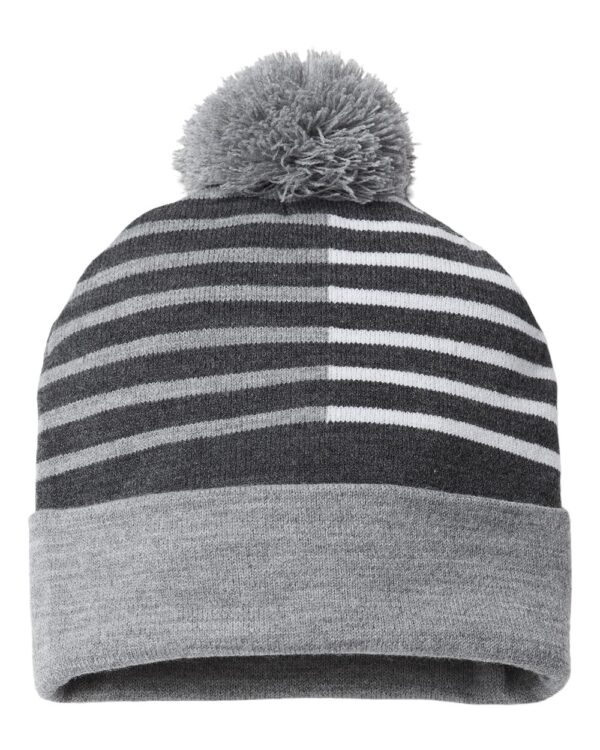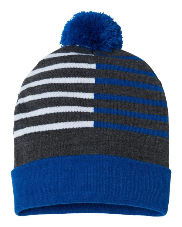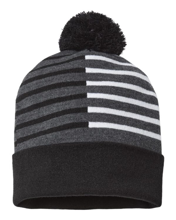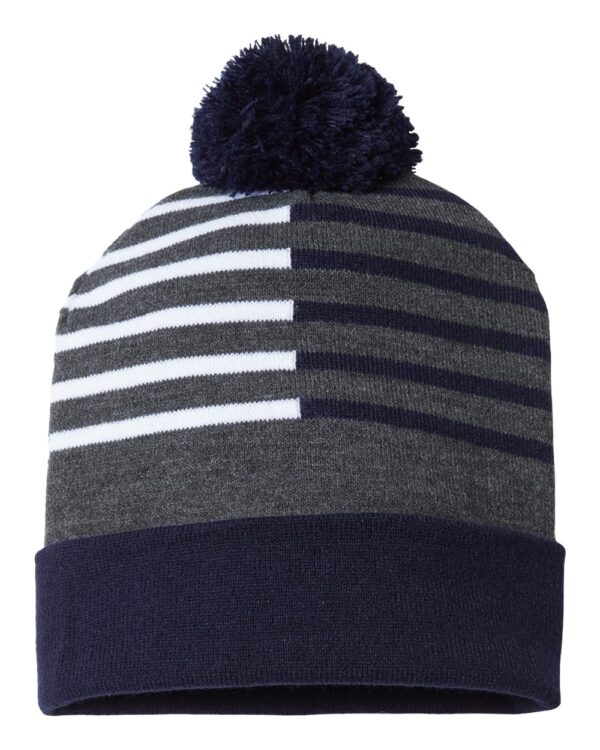 95/4/1 acrylic/nylon/spandex12" knit Pom-pom on topSolid adjustable cuffSplit stripes Made in the USA with imported yarn