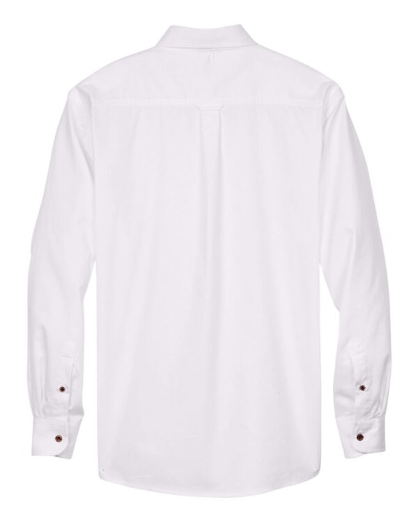 4.6oz/yd2 / 155 gsm (US), 7.7 oz/Lyd (CA), 55/45 cotton/polyester twill Stain-release and wrinkle-resistant performance Flat-felled seam finishing Extra stitching at seams and buttons Signature horn-style buttons with Harriton logo