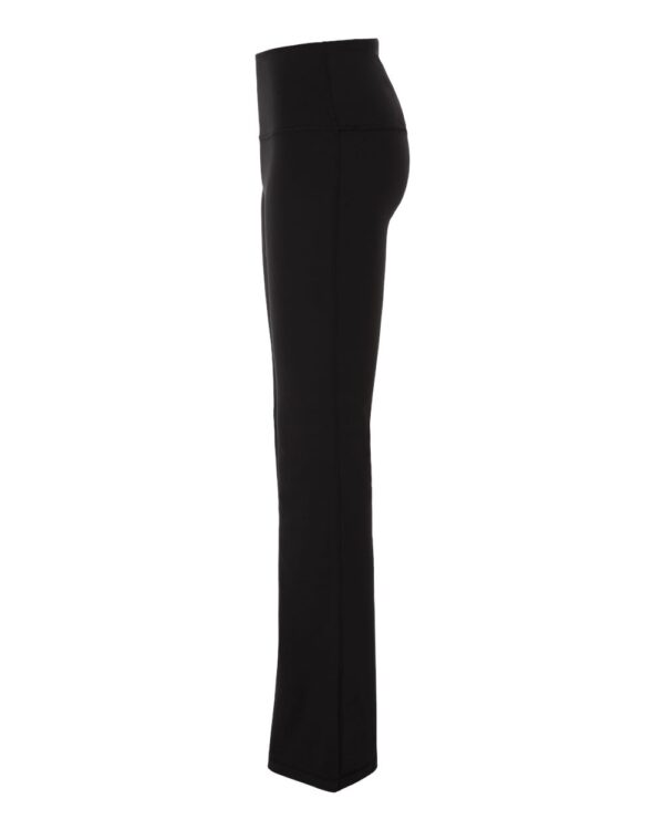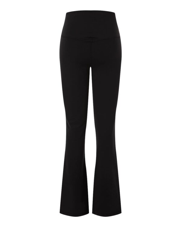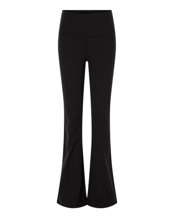 7 oz./yd², 78/22 recycled polyester/spandex peached flex knitMoisture-management propertiesFour-way stretch fabric for increased mobilityHigh waisted, wide flat waistbandBack internal key pocketFlatlock stitchingFlare leg bottom hemTag-free label
