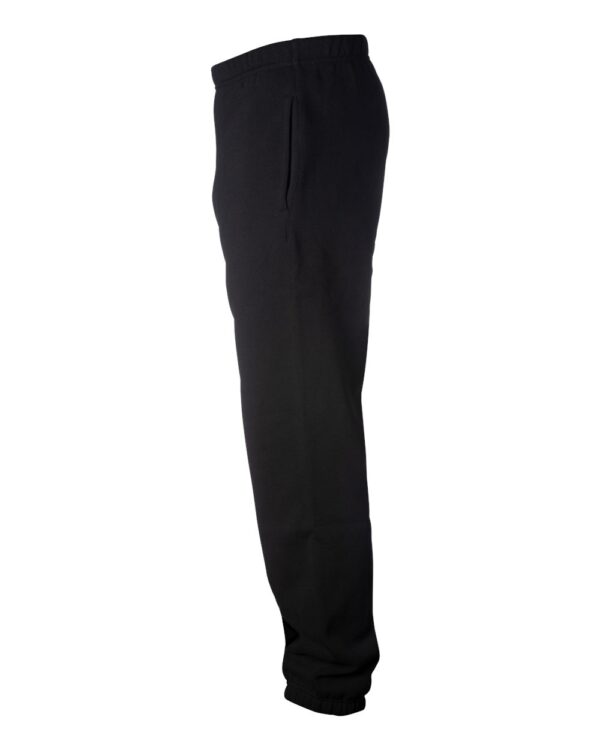 10 oz./yd²., 70/30 ring-spun cotton/polyester, 32 singles 100% cotton face yarnElastic waistband and ankle cuffsInterior shoestring drawcordSewn eyeletsJersey lined hand pocketsNo outseam for full leg screen printsTear away label
