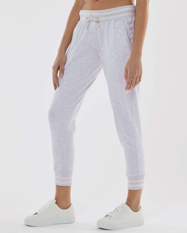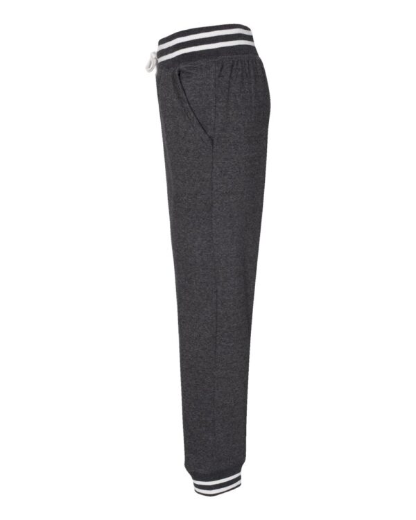6.5 oz./yd², 60/40 cotton/polyester single-dyed fleece1x1 ribbed yarn-dyed striped cuffs and waistbandOff-white external drawcordSide pocketsTear away label