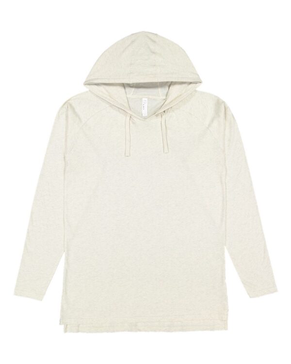 4.5 oz./yd², 60/40 combed ringspun cotton/polyester fine jerseyContrast-color three-piece hood construction, tackedContrast-color, cotton-hand, flat, braided drawcordSide seamsContrast color raglan long sleevesDouble-needle stitched sleeves and bottom hemDrop tail with side vent…