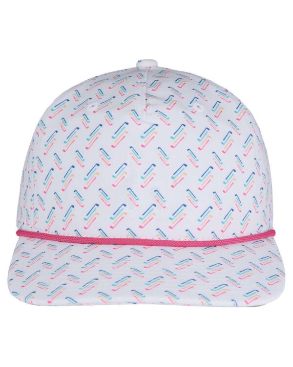88/12 polyester/ spandexStructured, five-panel, mid-profileSlightly curved bill with contrasting rope braidDual-enforced sweatbandSnapback closure